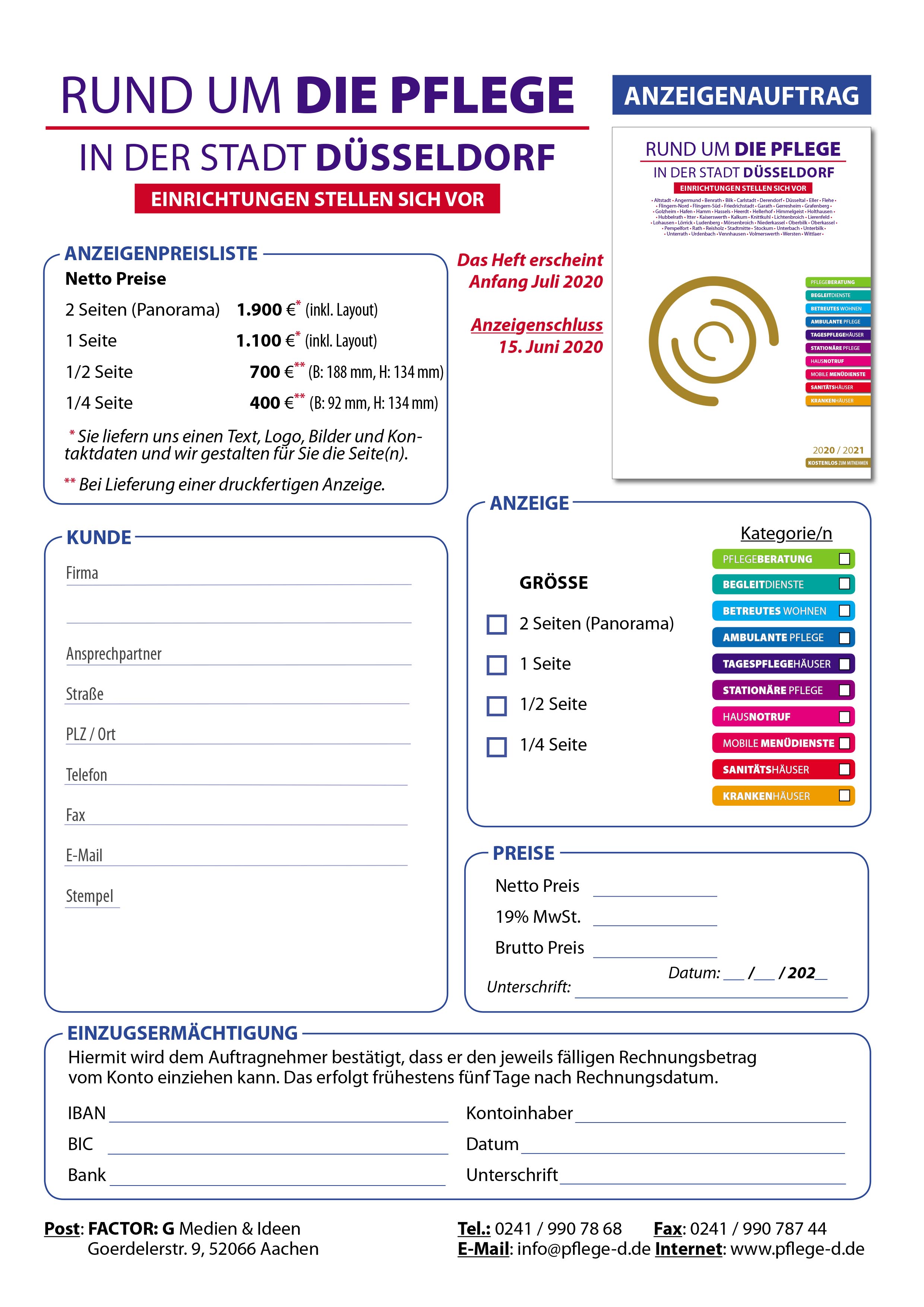 Jetzt möchten wir unsere übersichtlich gestaltete Broschüre, die alle Informationen über die Altenpflege und die Adressen aller Akteure enthält, auch für die Stadt Düsseldorf erstellen. Anfang Juli 2020 soll „Rund um die Pflege in der Stadt Düsseldorf“ in einer Auflage von 25.000 Exemplaren im DIN-A4-Format auf 115 g Seidenmattpapier erscheinen und im Anschluss an über 500 Auslegestellen (alle Rat- und Gemeindehäuser, alle Apotheken, alle Pflegestützpunkte und viele Seniorentreffpunkte) ausliegen. Sollten Sie sich nicht sofort entschließen können in unserer Broschüre zu werben, stellen wir Ihnen unser Konzept gerne ausführlich vor.
